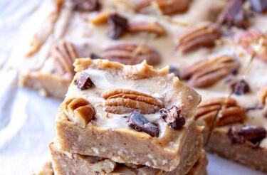 Répartissez le caramel de façon homogène sur le mélange précédent. Placez 1h minimum au réfrigérateur pour qu’il durcisse. Coupez en 16 carrés et dégustez !